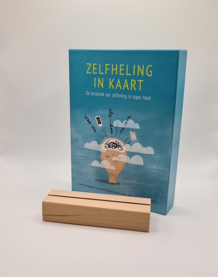 ‘Zelfheling in kaart’ bestaat uit 49 rijk geïllustreerde kaarten met uitleg en advies op de achterzijde, 1 introkaart, een houten kaartenhouder en toegang tot handige werkbladen. Je kunt het zien als ‘therapie in een doosje’ waarmee je achtereenvolgens langs de 7 fasen van zelfheling geleid word, praktisch, speels, concreet en diepgaand: